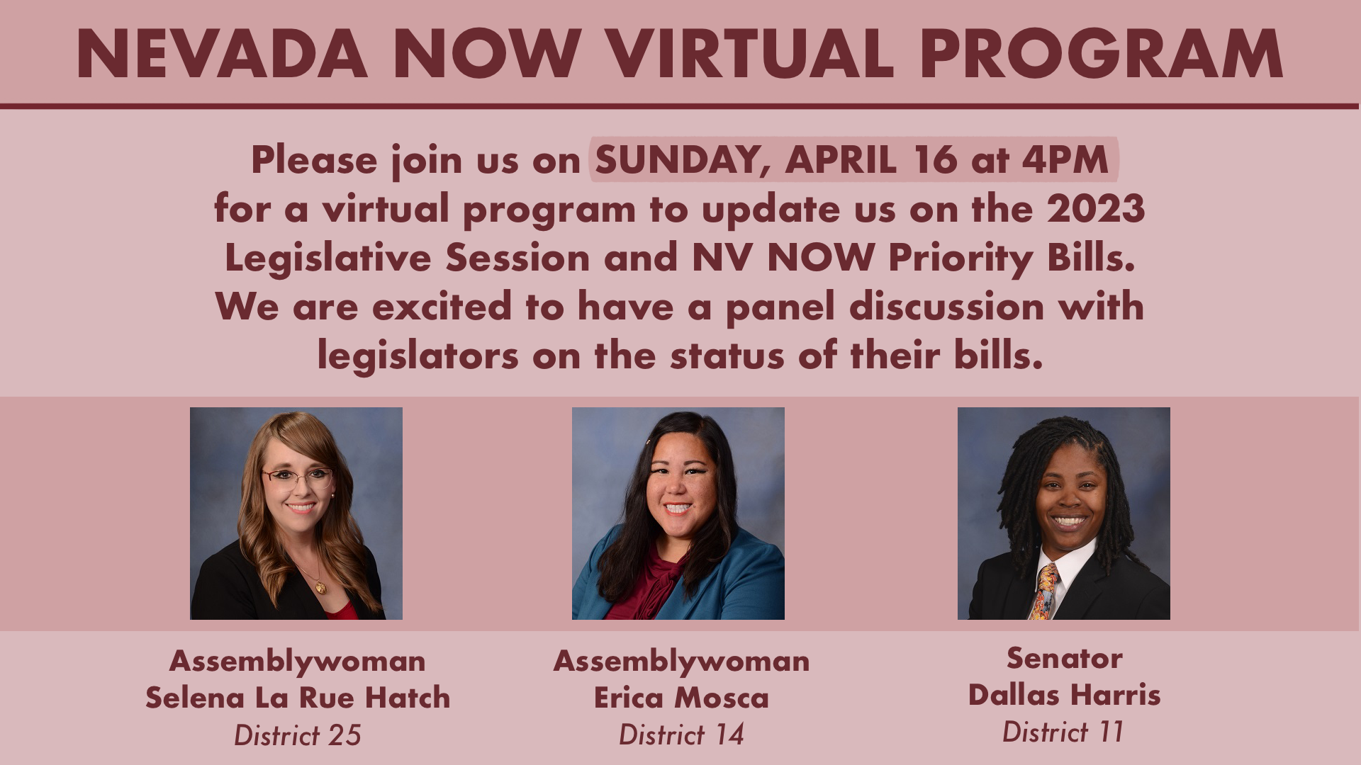 Please join us virtually on Sunday, April 16th at 4pm for a panel discussion with three amazing Nevada legislators for an update on the 2023 Legislative Session. We will also have an update on Nevada NOW’s priority bills. And we will be introducing members of our new Advisory Board! Please register for the program here.